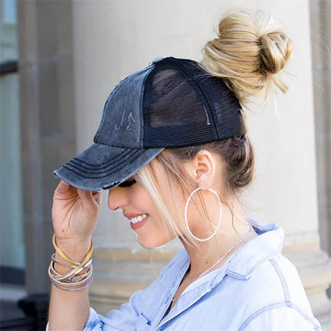 O Boné Talinia® oferece uma abertura traseira prática para passar o rabo de cavalo, mantendo seu estilo impecável. Ajustável com velcro, proporciona conforto sem comprimir o cabelo.